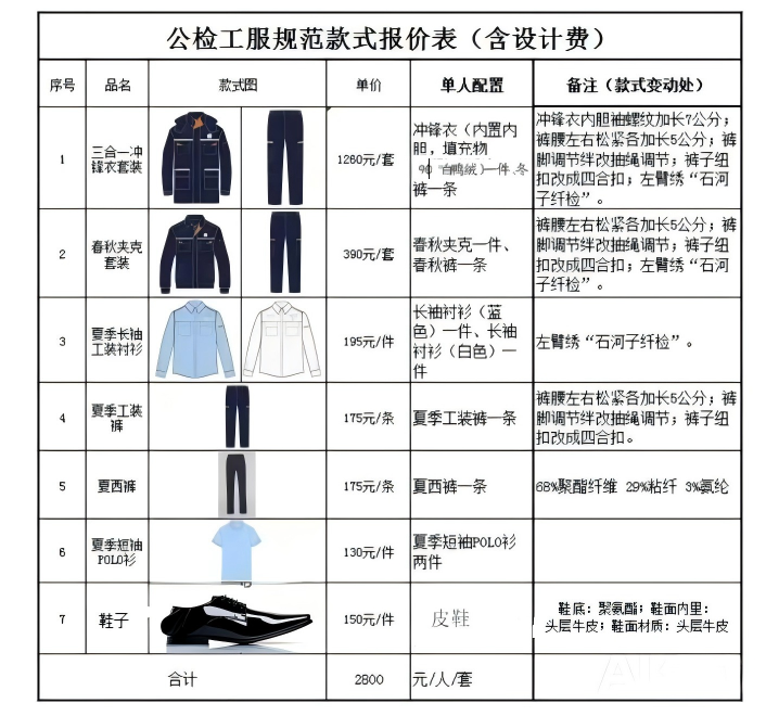 | 公检工作服装 | 核心参数要求: 商品类目: 车间作业人员服装; 三合一冲锋衣套装:冲锋衣(内置内胆)一件、冬裤一件 按照 GB 18401-2010 C 类,GB/T 32614-2016《户外运动服装 冲 锋衣》合格品 Ⅱ级,FZ/T 64003-2021《喷胶棉絮片》进行测试和评 价;春秋夹克套装:春秋夹克一件、春秋裤一件 按照 GB 18401-2010 C 类,FZ/T 81007-2022《单夹服装》合格品 进行测试和评价;夏季长袖工装衬衫:衬衫按照 GB 18401-2010 B 类,GB/T 2660-2017《单夹服装》合格品 进行测试和评价;夏季工装裤:夏季工装裤两件按照 GB 18401-2010 B 类,FZ/T 81007-2022《单夹服装》合格品 进行测试和评价;夏季短袖 POLO 衫:按照 GB 18401-2010 B 类,GB/T 22849-2014《针织 T 恤衫》合格 品进行测试和评价。;鞋子:鞋底:聚氨酯;鞋面内里:头层牛皮;鞋面材质:头层牛皮;采购人需求描述:上传材料详见采购需求附件; 次要参数要求: | 35套 | 98000.00 | - |
